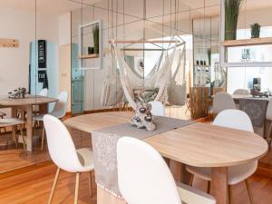 Die komplett ausgestattete Küche verfügt über moderne Geräte wie Kühlschrank, Geschirrspüler, Mikrowelle mit Toasterfunktion sowie Wasserkocher und Kaffeemaschine. Der Essbereich ist im Wohnraum integriert und beinhaltet einen Esstisch. Für die Sicherheit steht im Apartment außerdem ein Feuerlöscher zur Verfügung.